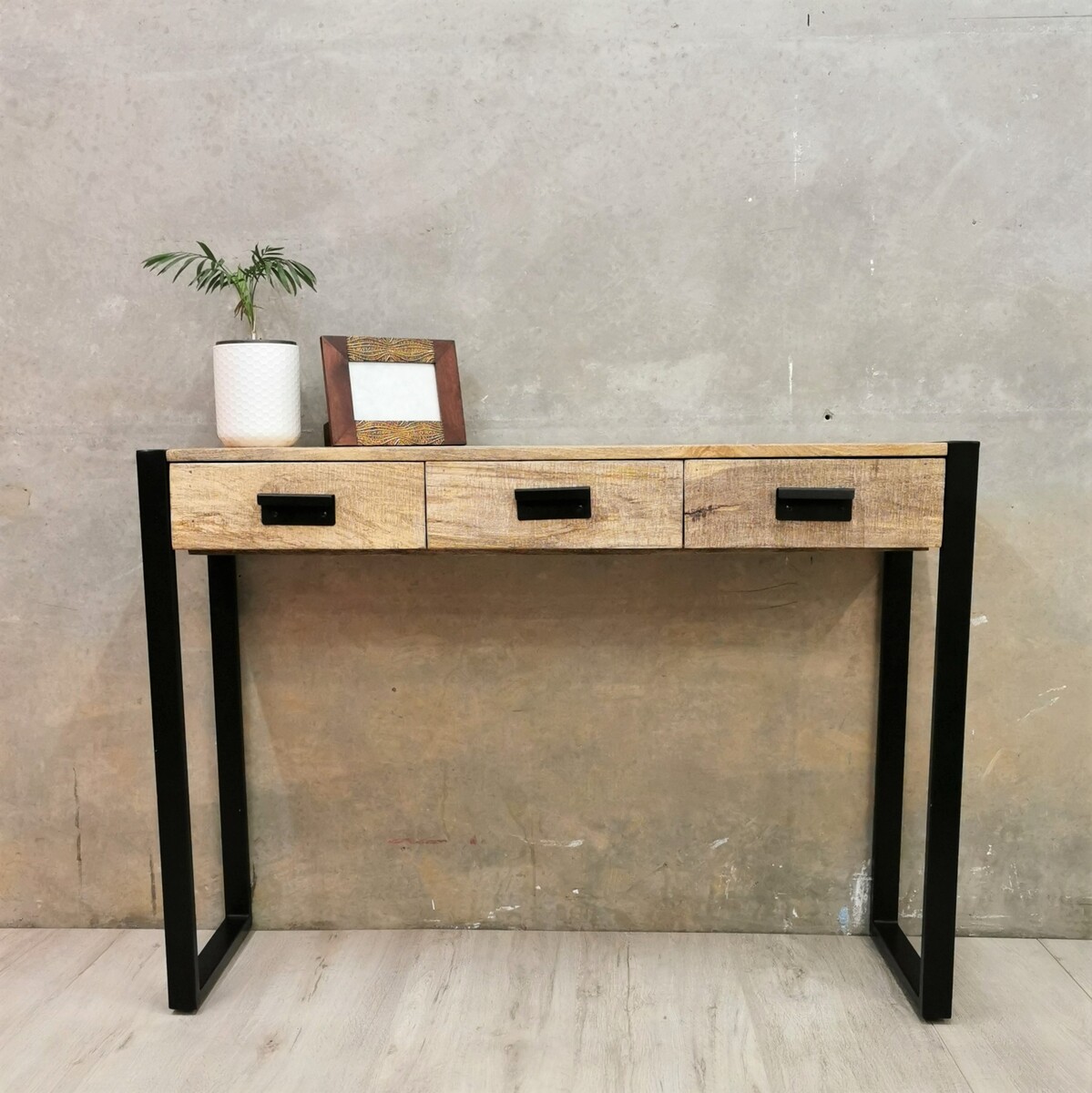 Its solid mango wood top provides ample space to display decorative objects, photo frames, or even potted plants, while you can keep small items like keys, notepads, pens, and other knick-knacks in its three spacious drawers. Its iron box legs add to its sturdiness and stunning industrial style. The visible grain structure makes every piece of furniture unique and slightly different from the next. The console table is fully handmade, and the craftsmanship adds to its spectacular retro style. Every step of the process is carried out with the greatest care, be it polishing, painting or lacquering.