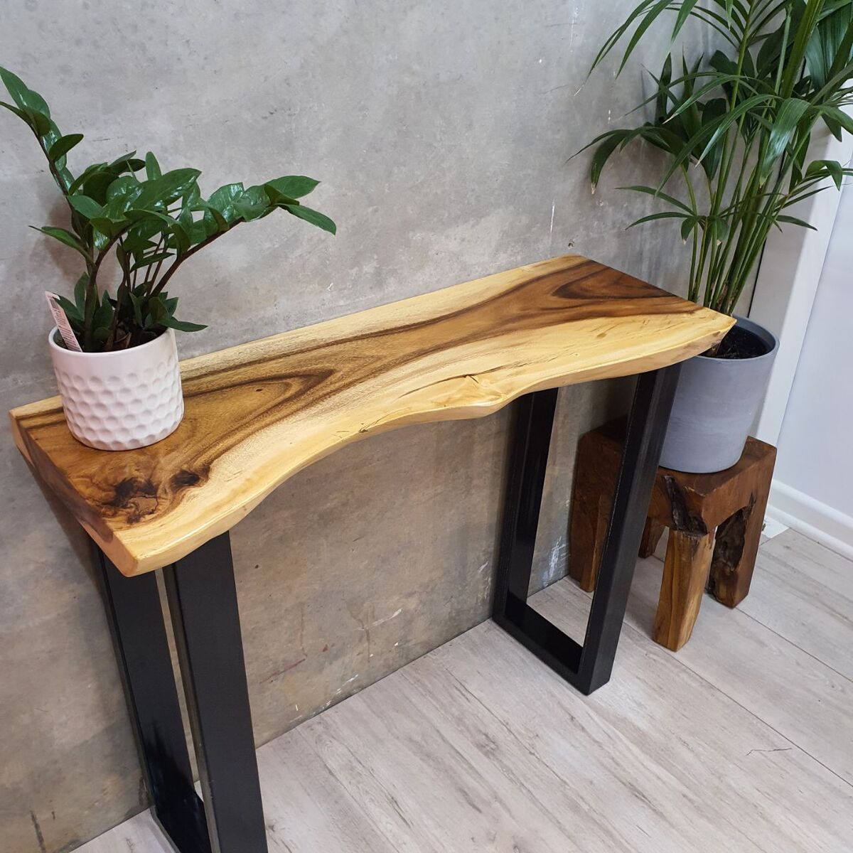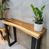 Please note that each piece of our "Bungalow" Live Edge Raintree Wood Console Table/Hallway Table is one-of-a-kind due to the use of natural live edge timber. As with all natural wood products, minor imperfections such as cracks and burrs may be present, adding to the character and rustic charm of the table. These unique features are part of the table's allure and contribute to its individuality. Embrace the natural beauty and distinctive qualities of the wood, as they make each piece truly special and captivating.