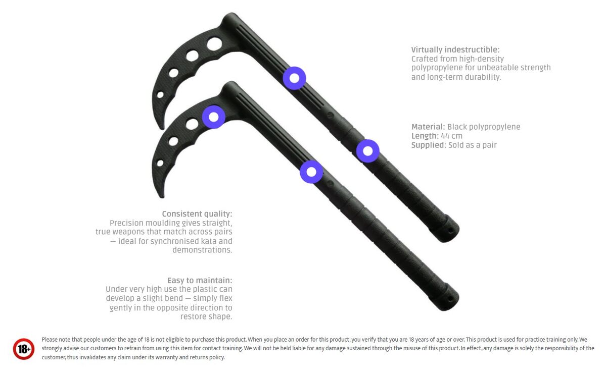 Our Training Kama are moulded from heavy-duty polypropylene specifically for full-contact practice. Tougher and more consistent than timber, the polypropylene construction delivers reliable performance session after session while remaining safe for partner work.