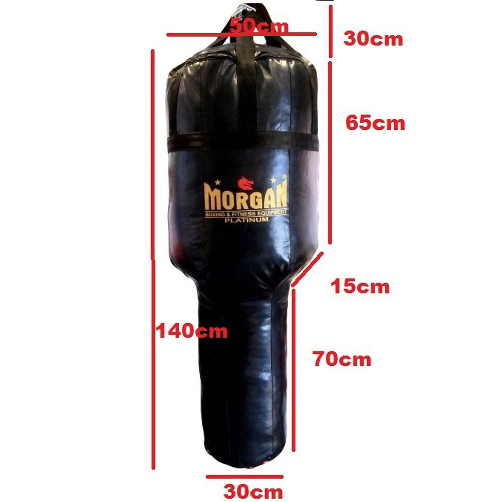The Morgan XL Angle punch bag is an oversized version of our standard angle bag, offering a larger, heavier and more robust striking surface, designed to train heavier uppercuts, stronger hooks, straighter punches, devastating jabs, killer low kicks and anything else you can think of. Manufactured using our 1000D ripstop viny and filled here in Australia using premium cotton and heavy fleece to create a super dense impact zone, evenly balancing the bag during filling, creates a life like a training experience. The unique shape is advantageous for punching at angles and uppercut shots. Durable nylon seat belt straps with stitched D-ring ensures that the bag can be used for all kinds of training, whilst an additional tie down loop located at the bottom of the kg bag for stabilisation
